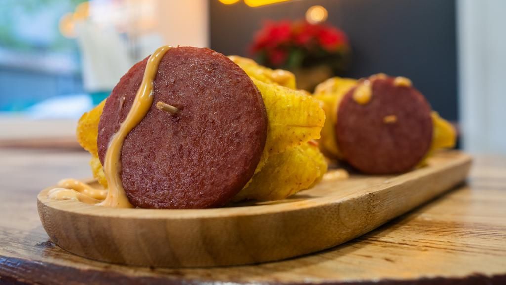 Patacón con salami, bañados en nuestra salsa Sweet Chili.