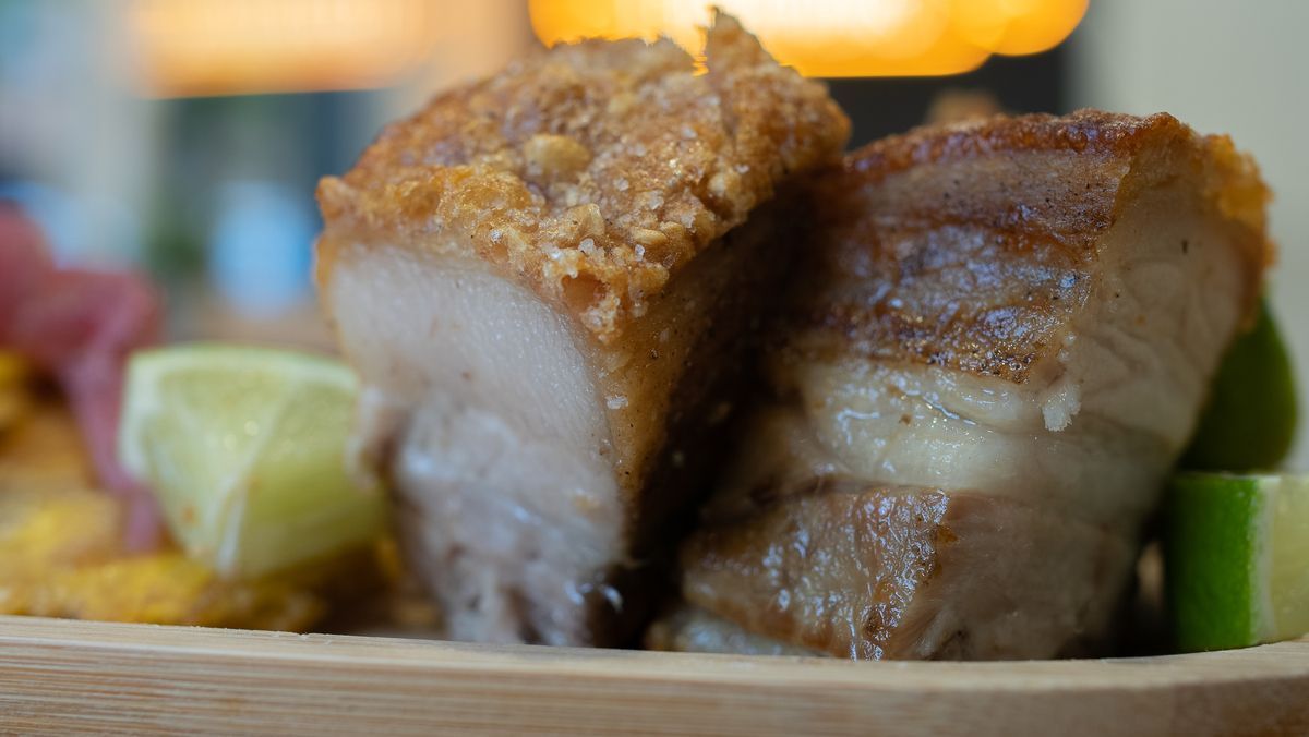 Barriga de cerdo horneada a baja temperatura acompañado de patacón frito encebollado.