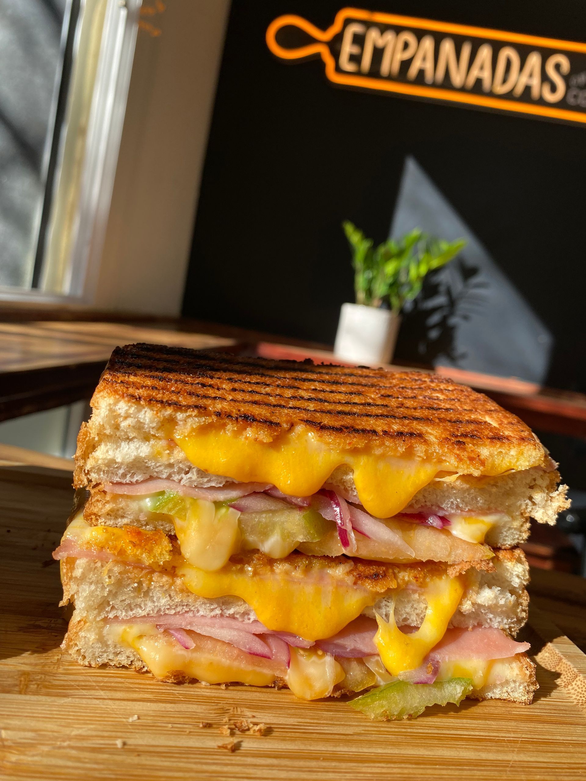 Sandwich dominicano aderezado con salsa, rodajas de tomate, queso blanco y queso amarillo fundido.