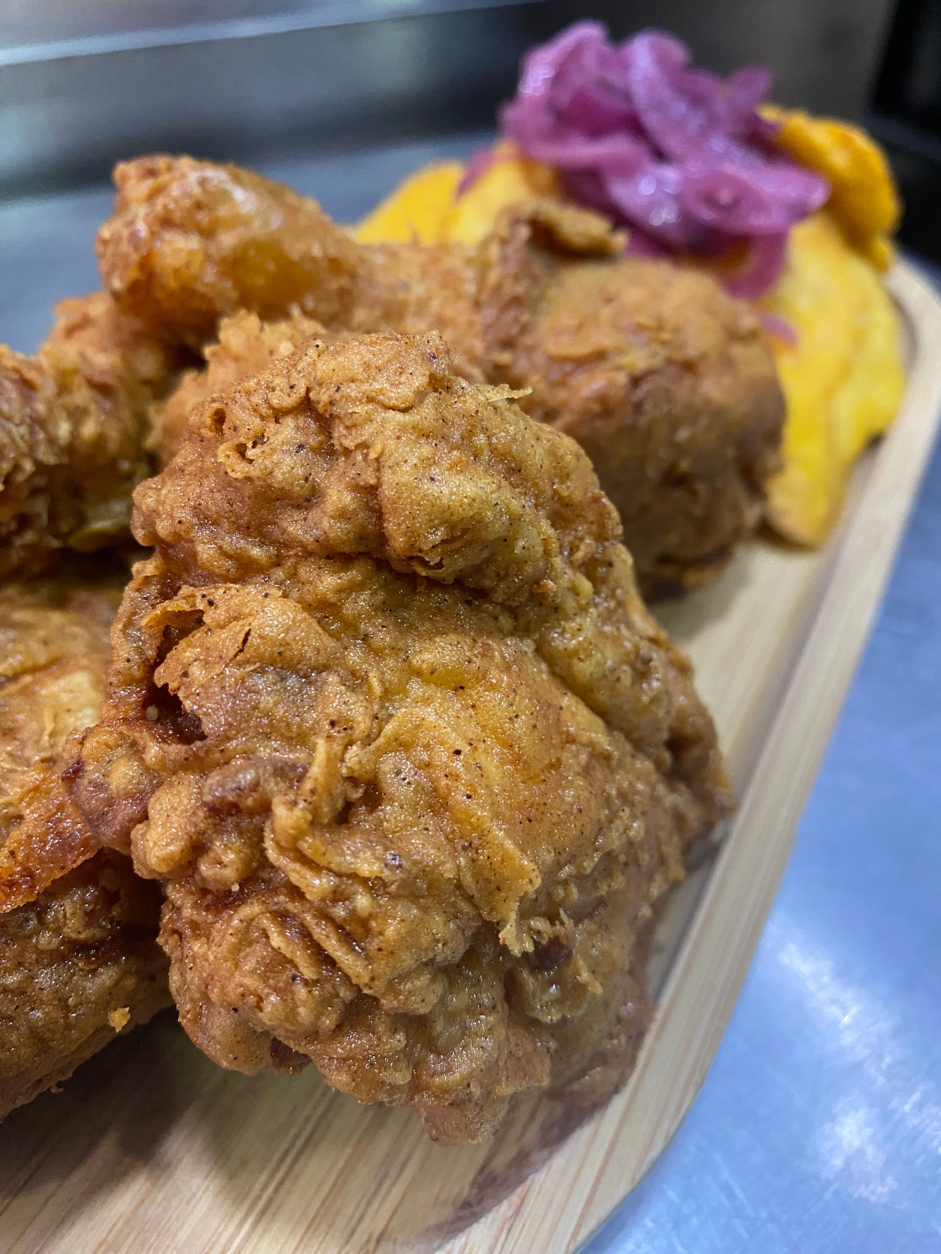 Muslos de pollo frito crujiente acompañados de patacón frito encebollado.